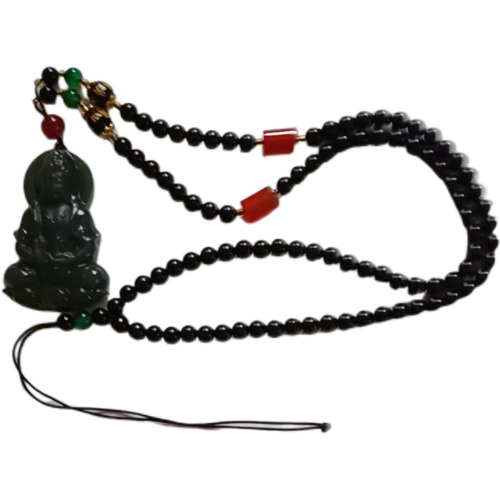 这枚观音吊坠的配珠,选用了黑色圆珠为主,搭配红色桶珠、绿色圆珠等。黑色珠子沉稳大气,与沙枣青的青色形成对比,凸显观音吊坠的主体地位;红色桶珠鲜艳夺目,为整体增添了一抹亮色,寓意吉祥;绿色圆珠则呼应了和田玉的温润质感,丰富了色彩层次。配珠的材质虽未明确,但从外观推测,可能是黑曜石、玛瑙等,这些材质与和田玉搭配,既符合传统玉石配饰的审美,又展现了现代搭配的创意,让观音吊坠在佩戴时,更具观赏性与个性 。